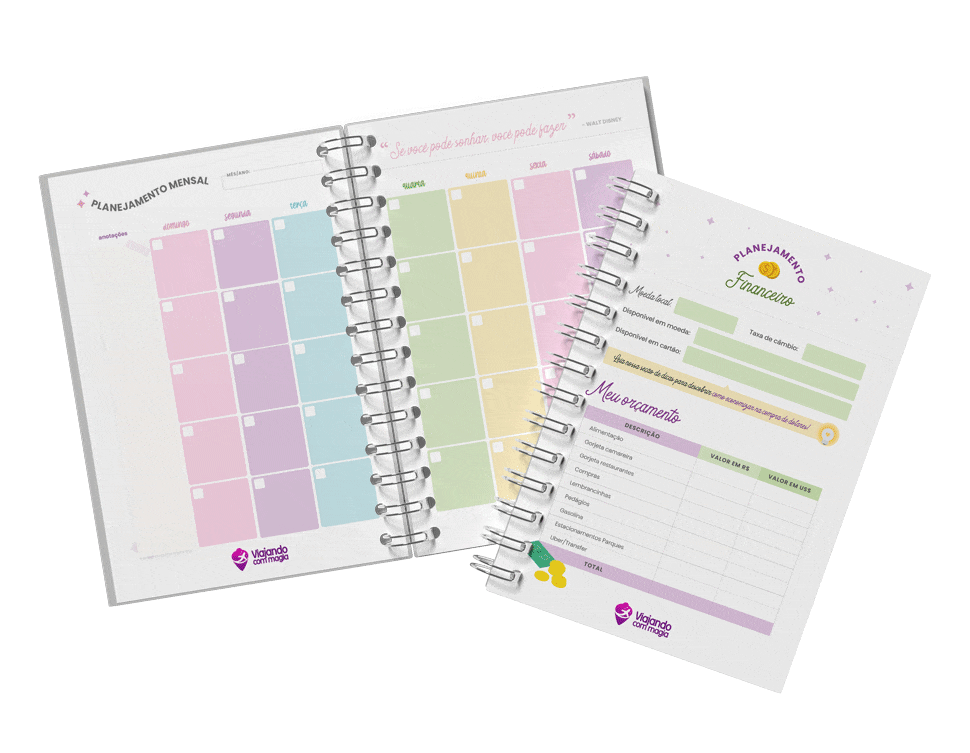 No nosso planner você poderá inserir suas informações de voo e reservas, encontrará espaço dedicado a seu planejamento mensal, semanal, financeiro e muito mais. Também terá espaço reservado para inserir seu planejamento de cada parque de Orlando e até colocar fotos. As páginas de checklist de planejamento e checklist das malas ajudam muito a não esquecer de nada! Além disso,o planner “Minha Viagem Mágica” é cheio de QR Codes: caso você queira saber mais sobre um determinado assunto, basta escanear o QR code correspondente e acessará as informações completas que temos em nosso blog. Ele é super interativo, além de funcional e lindo.